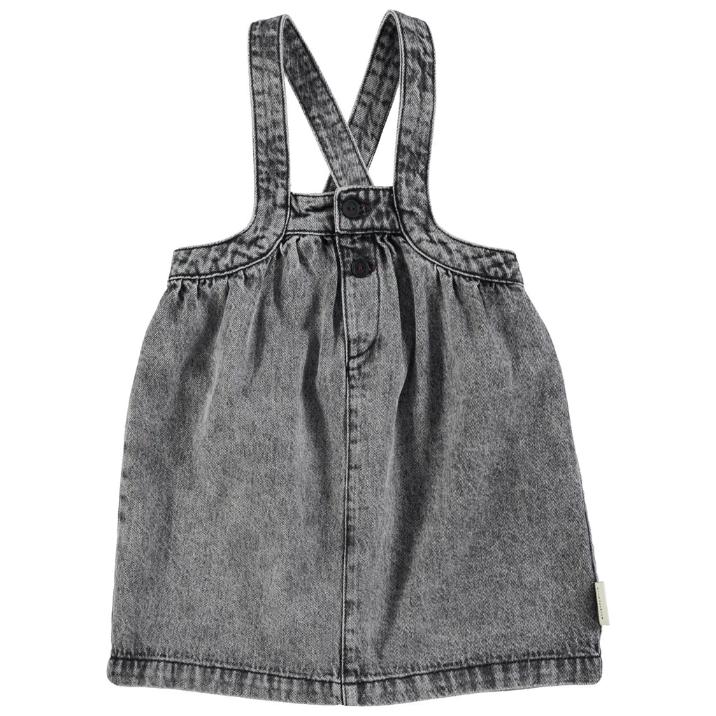 Knee-length dress with adjustable straps. Buttons at the front. Pleated effect.