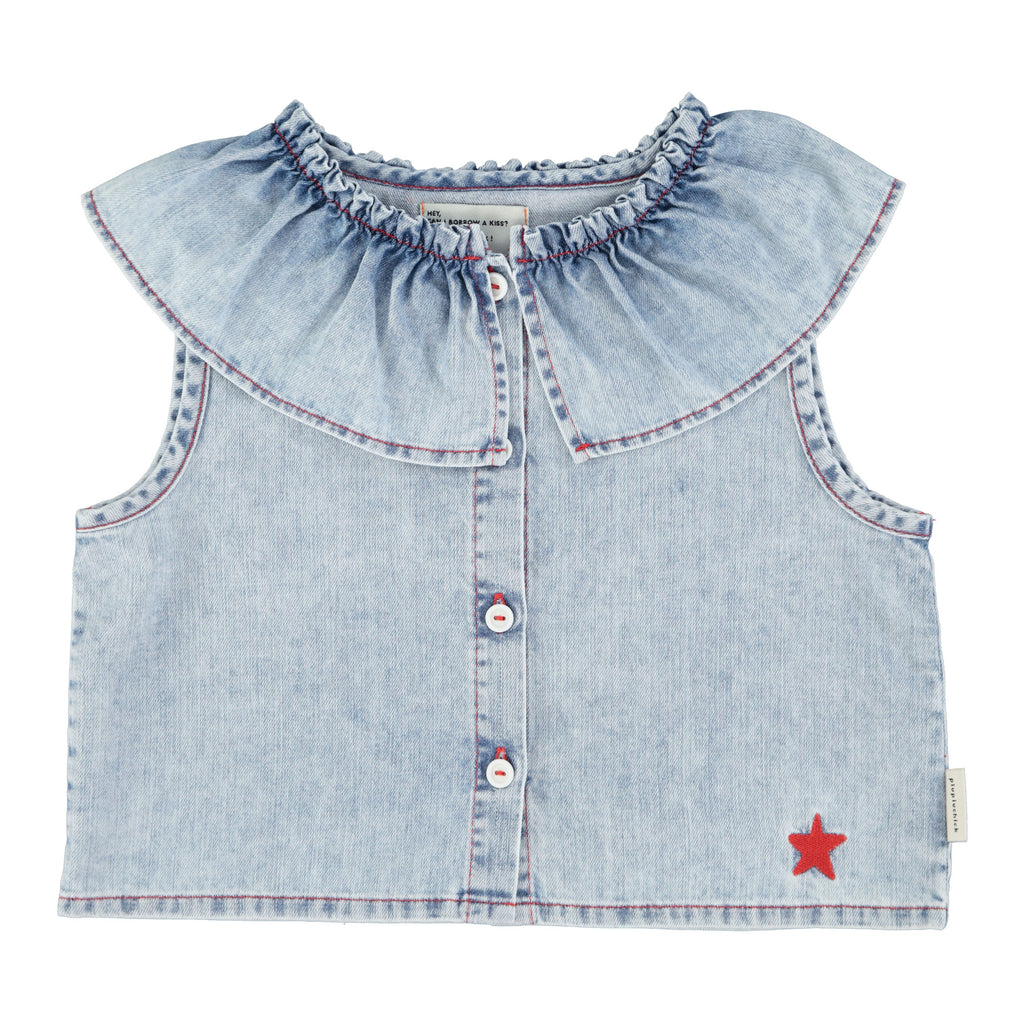 Sleeveless Shirt With Round Crimped Collar And Front White Buttons Panel. Detailed With Red Star Embroidered.
