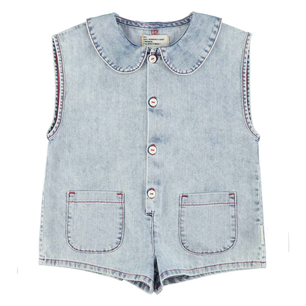 Short Sleeveless Jumpsuit With Round Collar. Two Front Patch Pockets. Front White Buttons. Detailed With Back Print And A Little Belt To Better Fit.