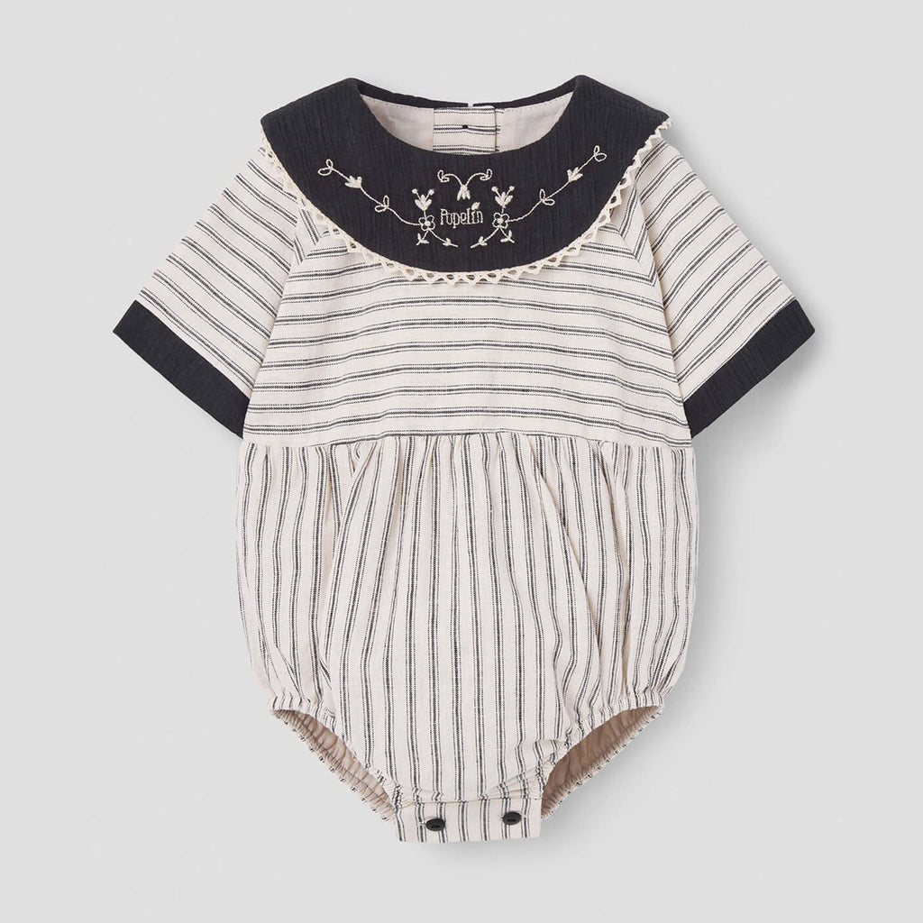 Popelin Black Striped Romper Suit With Embroidered Bib Collar